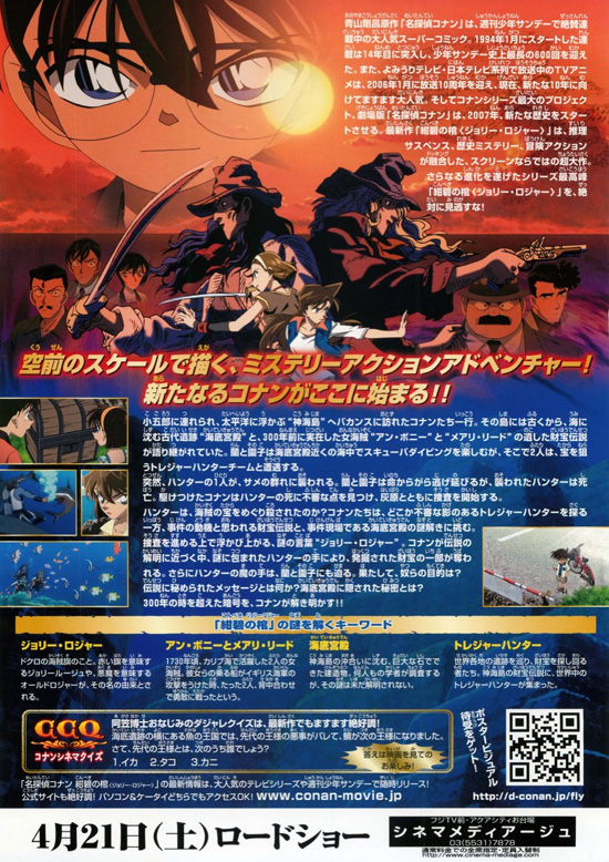 バカンスで神海島を訪れたコナン一行は、財宝探しに集まったトレジャーハンター一味と出会う。神海島は、海底の古代遺跡・海底宮殿が発見され有名になった島である。また、300年前に2人の女海賊アン・ボニーとメアリ・リードが遺したという財宝伝説も語り継がれている。興味を持ったコナン達は島の観光課が企画した宝探し、蘭と園子はダイビングとそれぞれバカンスを満喫する。そんな中、トレジャーハンターの1人が、海底宮殿を探索中にサメの群れに襲われ死亡した。当初は不幸な事故と思われたが、ダイビングスーツに残っていた痕跡から、コナンはこの事件が殺人だと推理する・・・ |