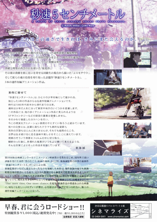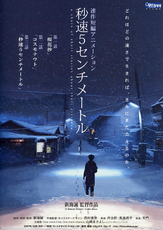 2007年3月このアニメが公開後、2007年9月に小説「小説・秒速5センチメートル」(新海誠)、2010年にコミック「秒速5センチメートル」(清家雪子)、2011年に小説「秒速5センチメートル