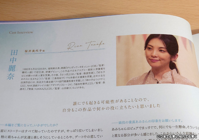 ひとつめは、萌の行動。余命幾ばくも無いという焦りはわかりますし、それが他の人にはわからない重要なことだというのもわかりますし、麗の言うようにそれが萌の魅力なのかもしれませんが、周りの人の感情に無頓着な側面は最後まで引っかかりました。なので、未来への手紙の内容も心にあまり響きませんでした。