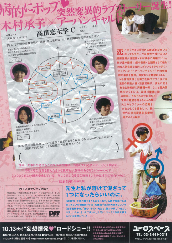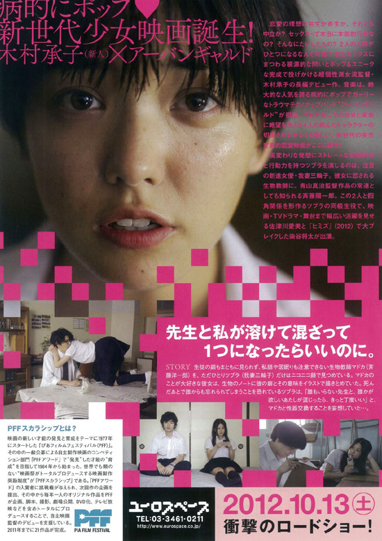 高校で生物の教師をしているマドカ(斉藤陽一郎)は、他人との接触を避け、授業中でも生徒の顔をまともに見られずにいる。そんなマドカのことが大好きな女子高生ツブラ(我妻三輪子)は、マドカの姿をイラストにして癖とその意味をノートに書き留めている一方、「死んだあとで誰からも忘れられてしまうこと」を恐れ、「腐らない体」を手に入れるために防腐剤入りの食べ物しか口にしない日々を過ごしている。そんなある日、ツブラはマドカと性器を交換することを妄想するが、ひょんなことからそれが現実となってしまい・・・ |