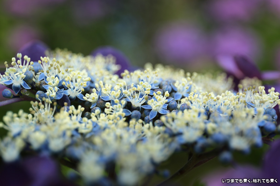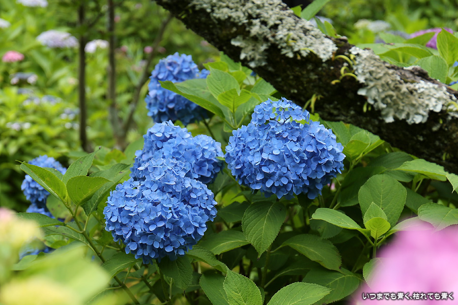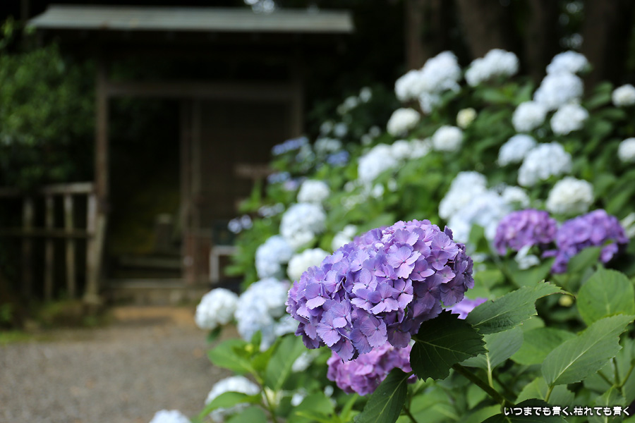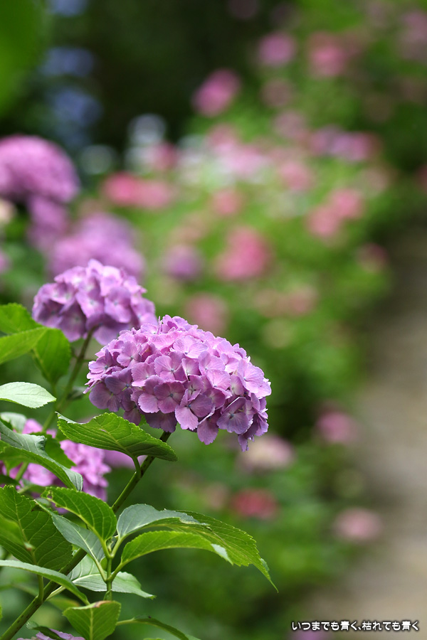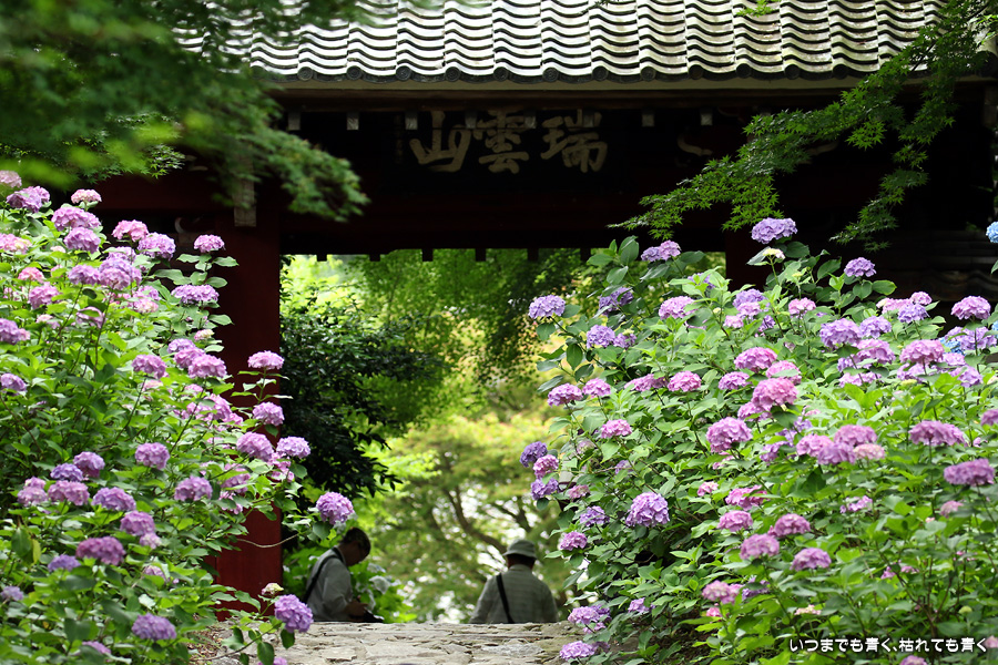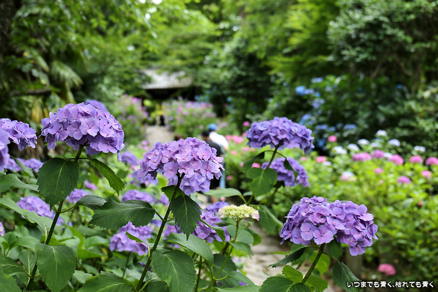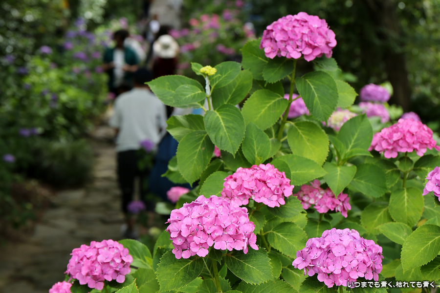 三河のあじさい寺、瑞雲山本光寺の紫陽花を家族で見に来ました。このお寺に紫陽花を見に来たのは今年で5回目(2010年、2011年、2012年、2014年、2016年)ですが、今日は、その5回の中で一番きれいではないかと思えるほど、花の状態が良かったです。すべての花が咲き始めたばかりの美しさで、目立つ傷みも全くありませんでした。そういう見ごろ最良日のせいか、私たちが帰る頃には駐車場に向かう道にクルマの行列ができるほどの人の多さでした。写真を撮る人も多くて、撮ろうとする構図の中からなかなか出てくれないのはお互い様で仕方がありませんが、あじさいの花の前でずっと三脚を置いたままにしていたり、カメラ談義を長々とするのだけはご勘弁といった感じでした。