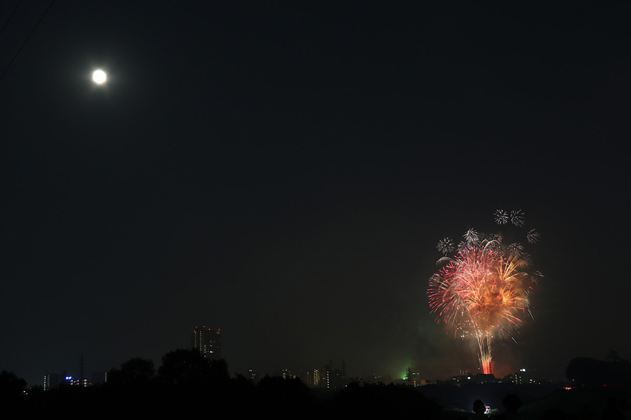 岡崎の花火は昨年初めて東公園から撮影したのですが、ちょっと遠すぎたので今年はもう少し近くでと思って矢作川西側堤防道路の国道1号線矢作橋と県道56号線日名橋のちょうど中間のあたりの場所を選びました。花火が上がってみると、これが大失敗。矢作川の打ち上げ場所と乙川の打ち上げ場所と撮影地点が正三角形に近い関係になっていて、両方の花火を一緒に入れての撮影がまったく絵になりませんでした。それぞれの花火は単調なので、競演させないと迫力がでません。そして堤防は人があふれ片側の撮影はどうしても人が入ってしまいます。満月に近い夜も空が明るくてダメですね。来年は両方が並んで見える地点(西側か東側?)を探したいと思います。途中から飽きてしまい、金曜日にブルームーン満月だった月と花火と二重露光させて、存在しない場所に月を写し込んだ写真を撮ってみたりして遊んでいました。