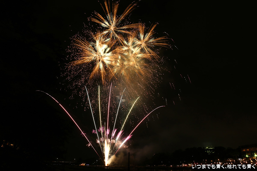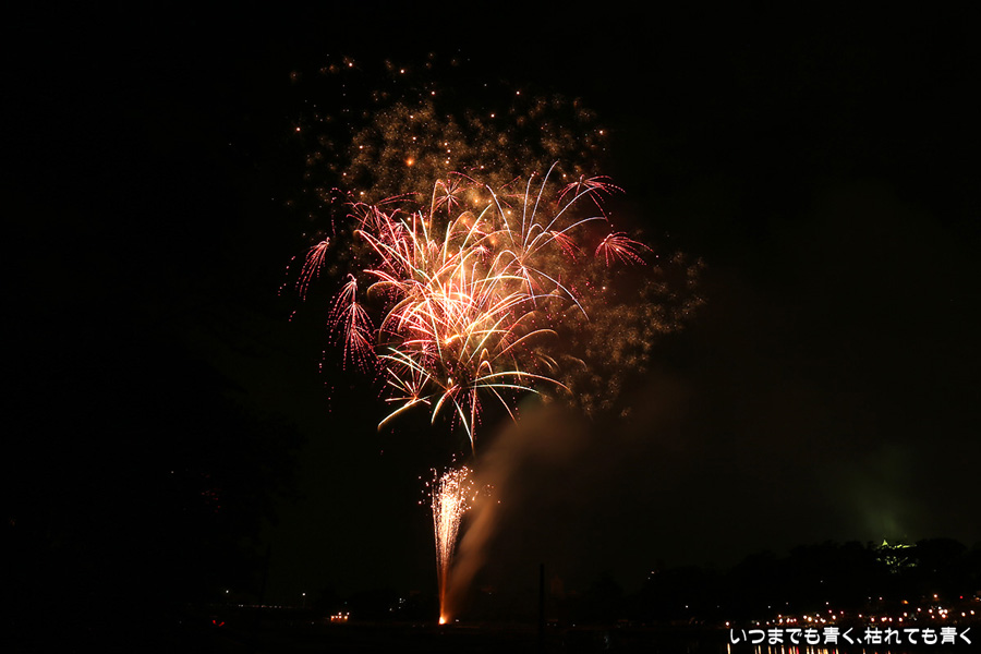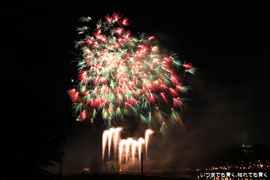 岡崎の花火は、人混みが嫌でいつも遠くから見るだけで近くでは見たことがなかったのですが、病気が判明したため行けるうちに一度は行っておこうと思って、風邪気味で体調イマイチでしたが無理して近くで撮影してきました。乙川河川敷に陣取ったのですが、矢作川河畔で打ち上げる花火は木で隠れて見えなかったものの、乙川河畔の打上花火や仕掛花火は目の前で見ることができ、迫力満点でした。やっぱり花火は近くで見るに限ります。先週の豊田市のおいでんまつりの花火よりも種類も内容も充実していたように感じました。ただ、写真撮影は近くよりも少し離れているほうが良いようです。岡崎城と一緒に撮ろうと思っていたのですがそれもあまり絵にならず、花火に近いため静止画にすると高さも感じられず、連続打ち上げが多いため単調な絵になったりとまた不満ばかりです。花火の写真としては、おいでんまつりの花火のほうがお気に入りは多かったです。近くでは静止画の美しさよりも動画の迫力と思いましたので、今回は動画も少し撮りましたので