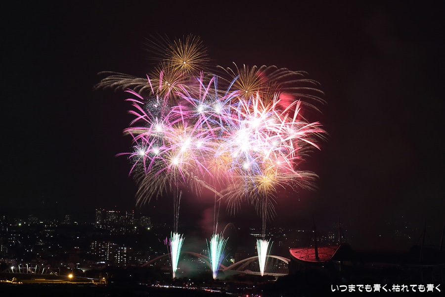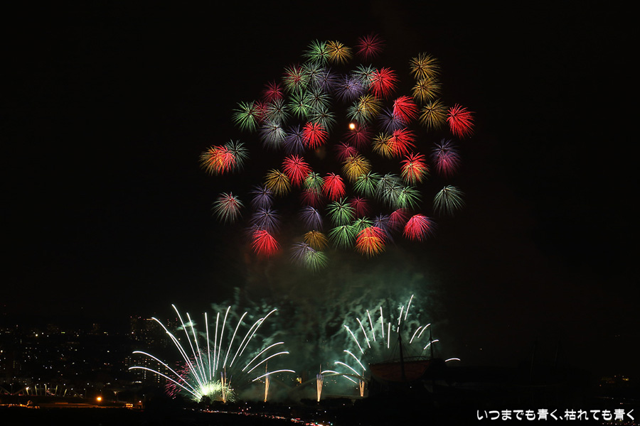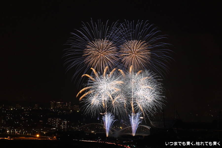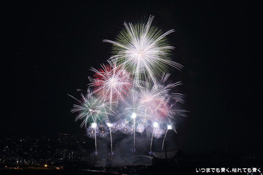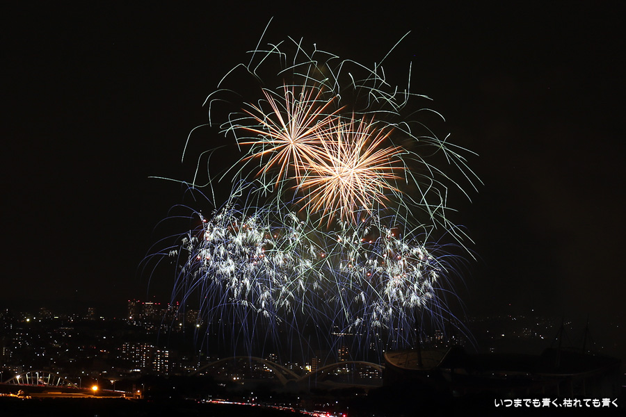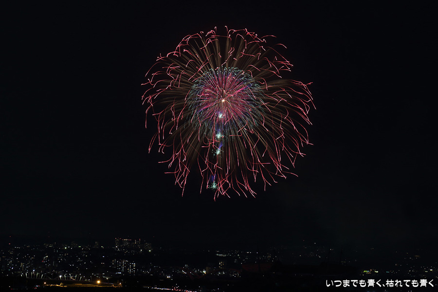 などあたらめて難しさを痛感しました。そんな状態でしたので、今回は面白い写真が少なかったように思います。花火自体も年々豪快さが乏しくなってきている感じもします。また、ここ3年は同じ場所からの撮影なので同じような写真ばかりになってきました。来年は撮影場所を変えたほうが良いかもしれませんが、他に良い場所を探すのも大変そうです。なお、重量級の望遠レンズで撮影した写真は三脚が耐え切れず、カメラが微妙に揺れて花火の軌跡が波打ってしまっているものがあります。細部には目を瞑ってご覧ください。