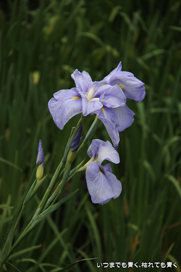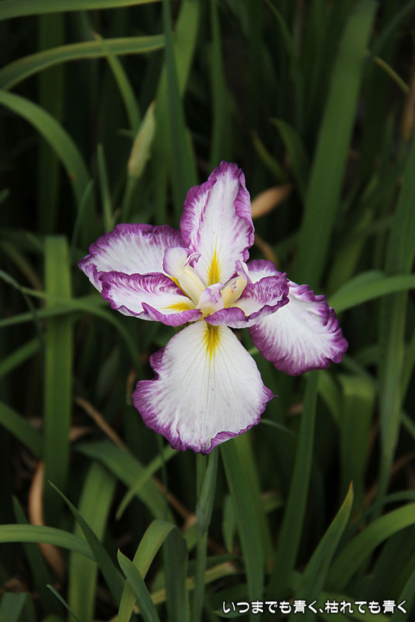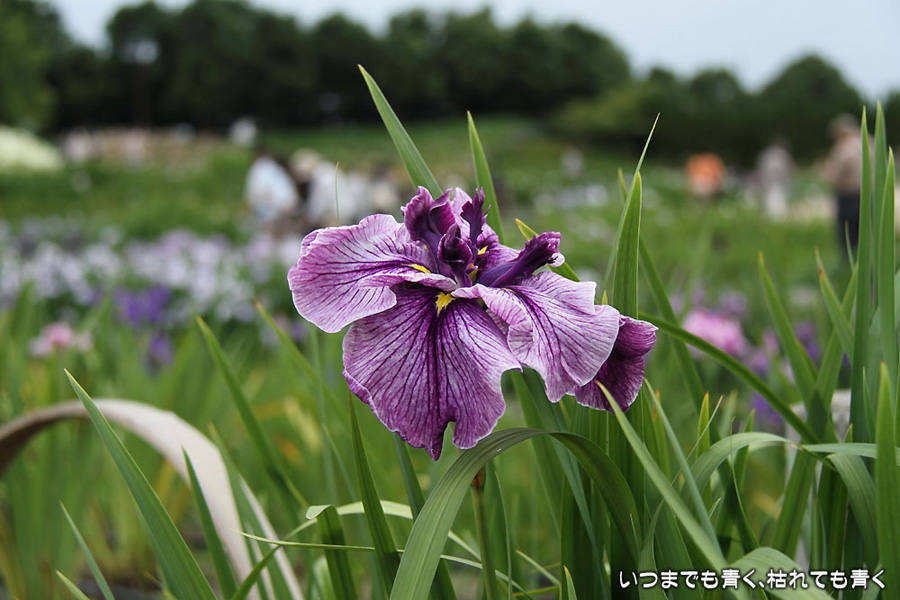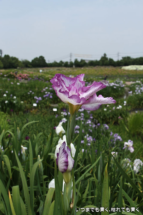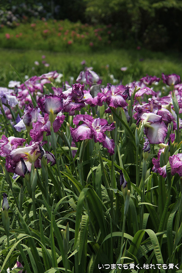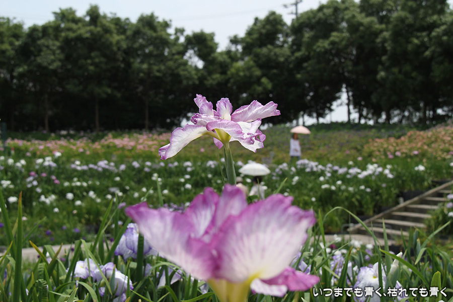 7月8日までは「あじさい・花しょうぶまつり」ということになっていましたが、紫陽花はもう時期が過ぎていました。しかも、花壇に植えられた紫陽花というのは、風情がなくてダメでした。紫陽花という花は、寺社などの庭が似合うような気がします。そのかわりに楽しんできたのが、花菖蒲。花菖蒲は、たくさんの数と種類が植えられていて、のんびりと眺めて楽しむことができました。花菖蒲も、紫陽花の花壇に囲まれた場所に植えられていて、周りの風景との調和を楽しむという風情はありませんが、数が多いので花菖蒲同士で構図をとって写真を楽しむということはできました。構図決めはなかなか難しいですが。相変わらず、ありきたりの構図の写真ですが、花菖蒲苑の雰囲気を残しておければと思います。