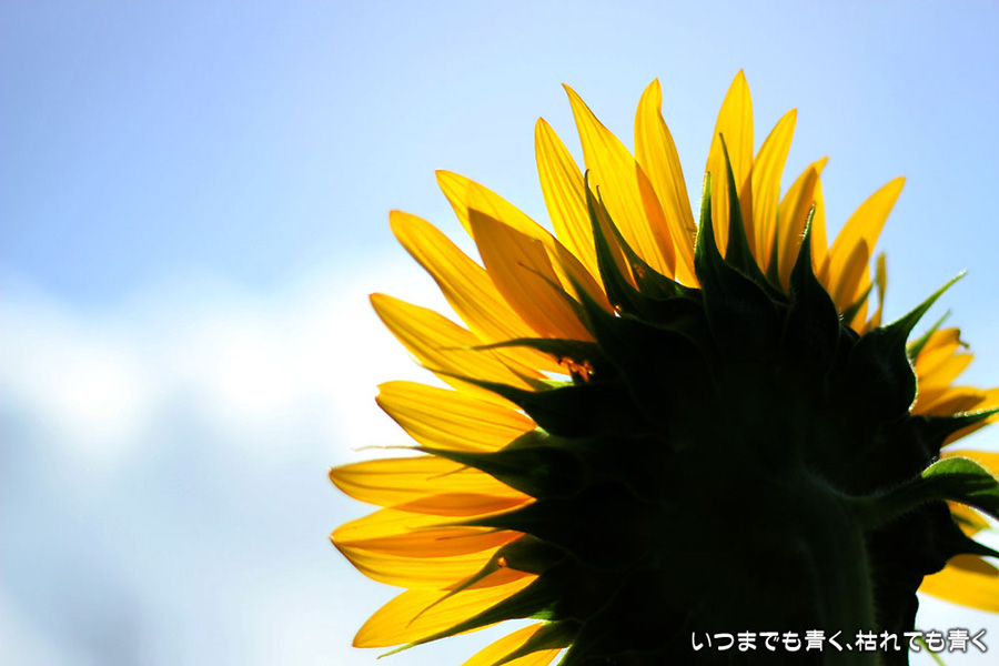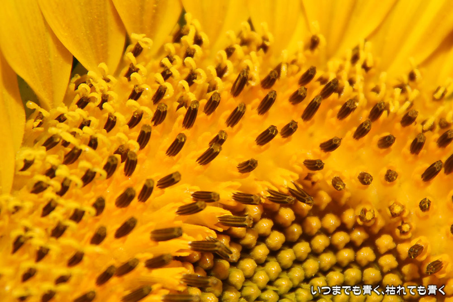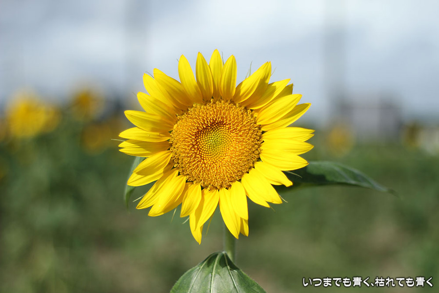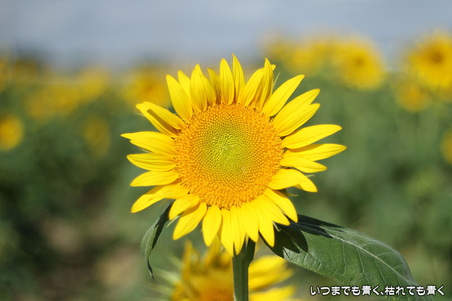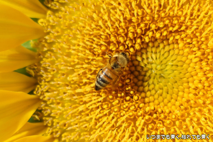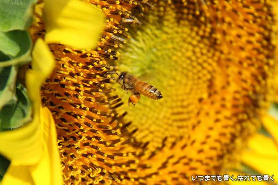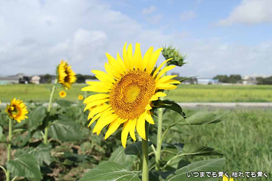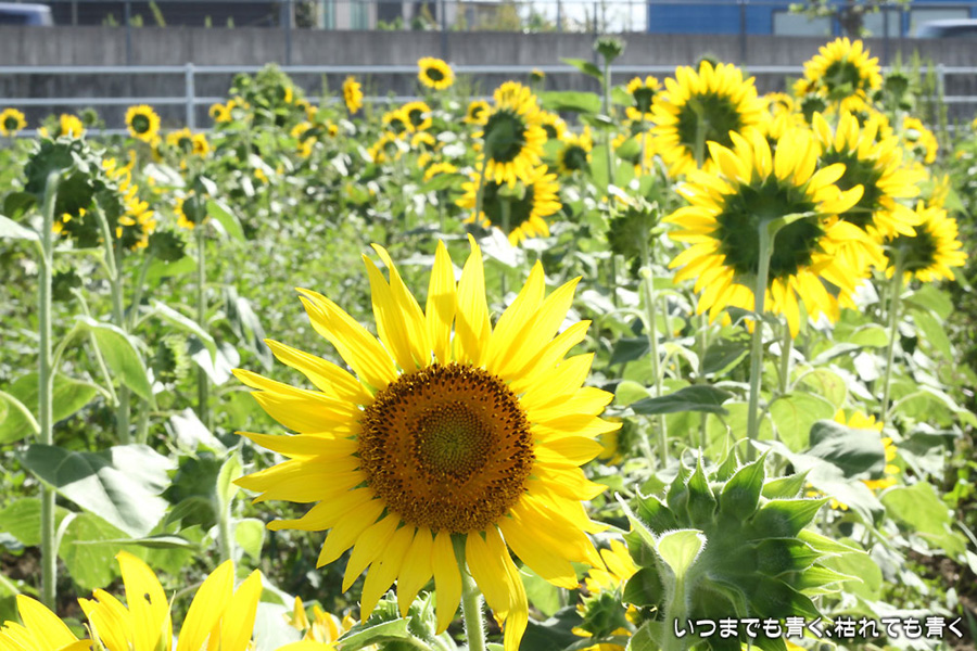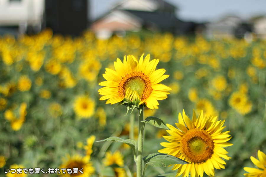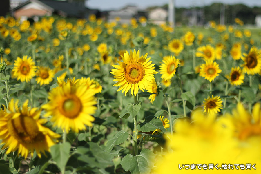 自分で運転していると気づきにくいのですが、先週、バスに乗って窓の外を眺めていて、家の近くの休耕地に向日葵(ひまわり)畑があることを知りましたので、今日、カメラを持って出かけてきました。そのあたりの休耕地は、農林水産省の農地・水・環境保全向上対策として、景観植物が植えてある場所です。以前に秋桜(コスモス)を撮りに来たことはあるのですが、向日葵が植えられているのは、初めて知りました。向日葵畑の隣の土地には秋桜の看板がありますので、もう少ししたら秋桜もまた楽しめるようです。向日葵は少し小ぶりの向日葵でしたが、これから咲こうとするものもあって、今が見頃とばかりに元気に美しく咲いていました。向日葵にはたくさんのミツバチが集まってきていて、一生懸命に花粉を集めているのが可愛らしかったです。周辺は住宅や電線があったりで、撮影に適した土地とは言い難いですが、夏が終わってから(残暑は厳しいですが・・・)向日葵畑に出会えるとは思っていませんでした。忘れた夏を取り戻したような感覚でした。