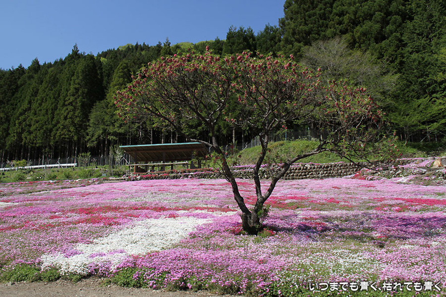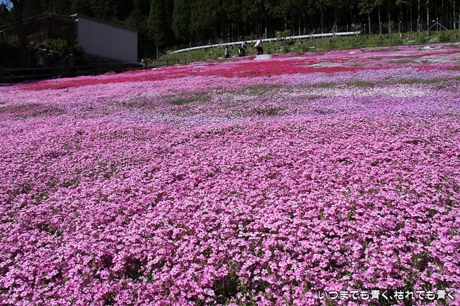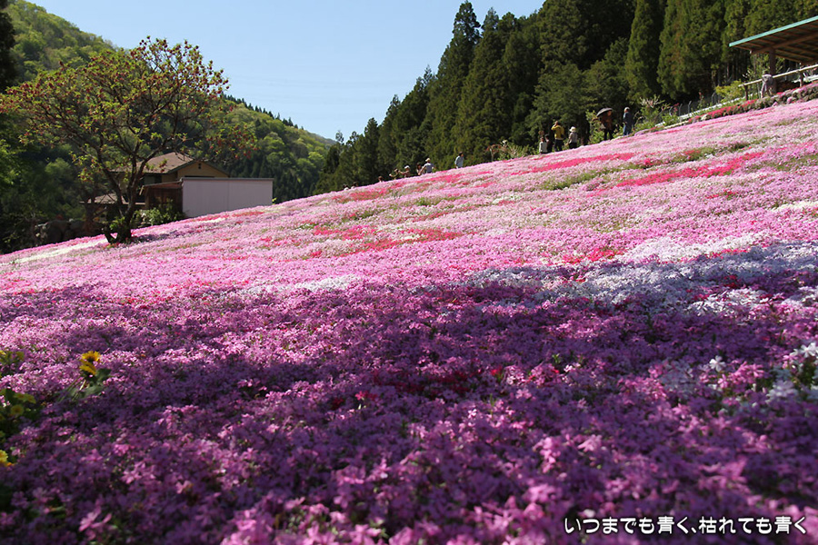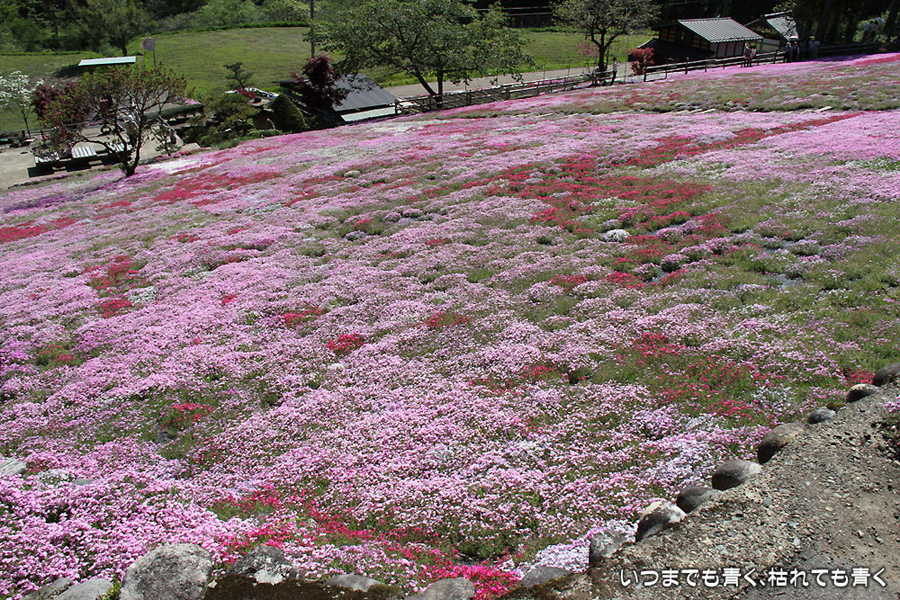 今日は昨日の雨が嘘のように暖かな快晴となりましたので、どうしても見ておきたくなった岐阜県郡上市の國田家の芝桜を見に行ってきました。見頃は4月末からゴールデンウィーク中だということでしたので、ひょっとしたらもう鑑賞に値しないかもと思って出かけましたが、まだピンクや赤の絨毯を充分楽むことができました。4月末だと、満開の芝桜と、桜、水仙、チューリップとの競演も見られて、一層華やかで美しいので、来年は見頃の時期に絶対に見に行こうと思います。國田のおばあちゃん(故人)の意思が、地域の方と見学者の募金でいつまでも引き継がれていくことを願います。