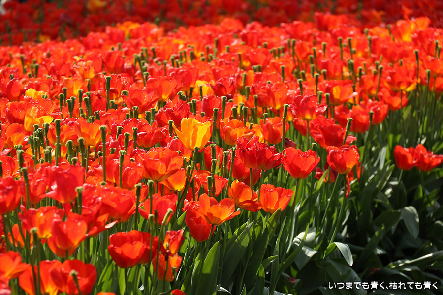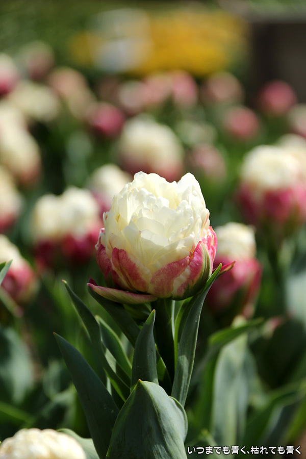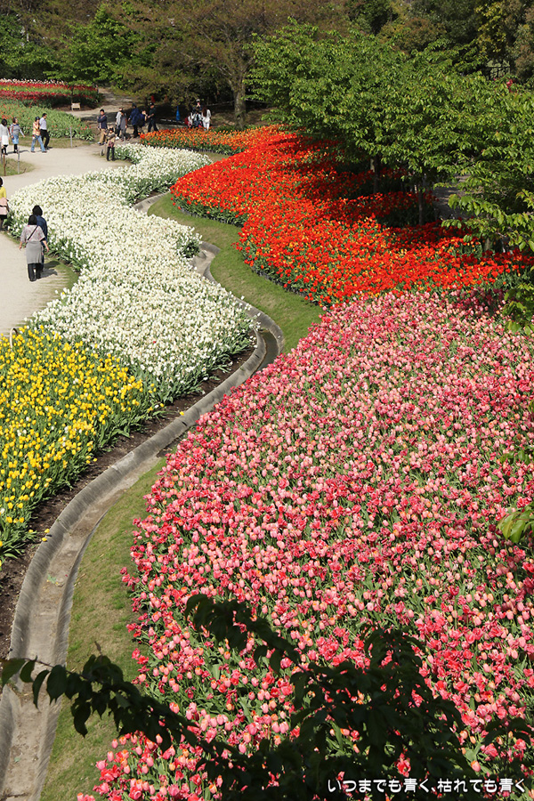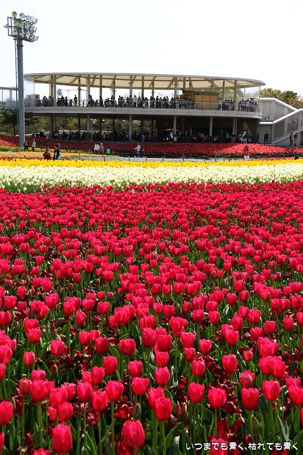 今年は土日の天候があまり良くなかったので、なばなの里のチューリップまつりに行くのはあきらめていたのですが、昨夜の地元ニュースで今が見ごろだと言っていたので、穏やかな日和にも誘われて行ってきました。確かに見ごろのチューリップも多かったですが、すでに花を落としているものや花びらが弱っているものも多くて、実際は見頃の時期はもう過ぎているなぁという感じでした。夜にはライトアップもされるのですが、花がそんな状態だったのと、ウインターイルミネーションが延長開催されているために夜になると人が多くなってきたので、日が落ちる前に早々に引き揚げてきました。