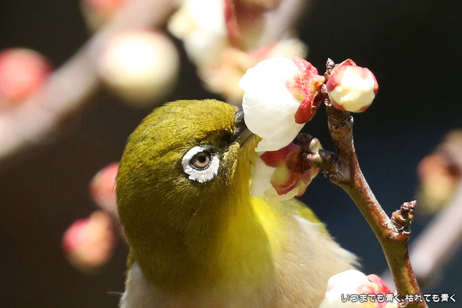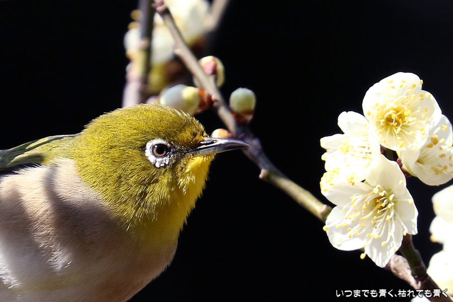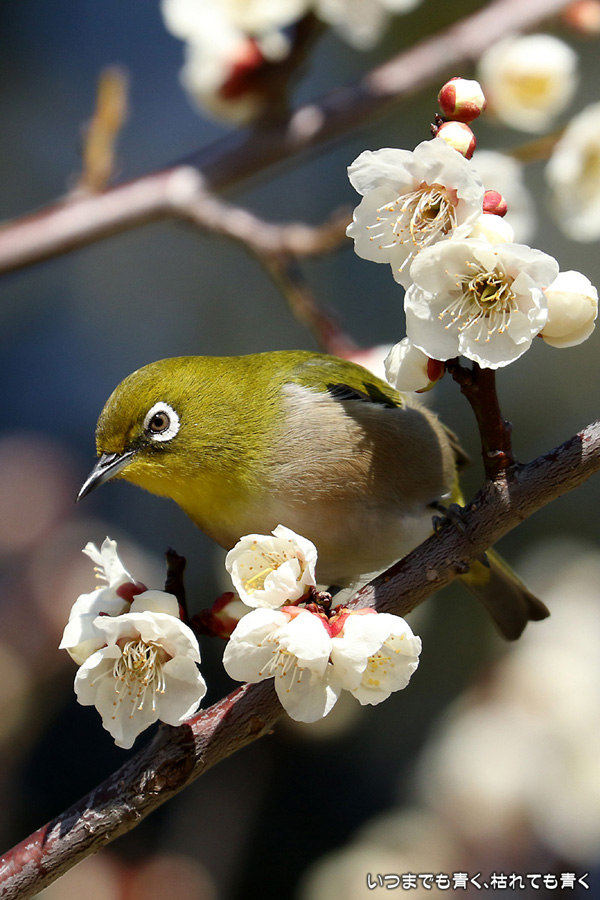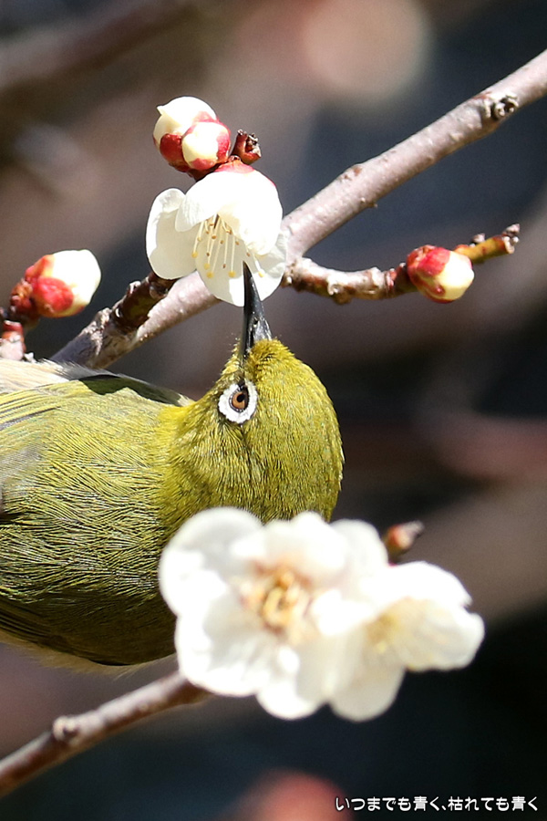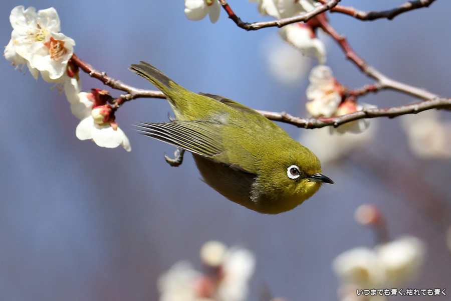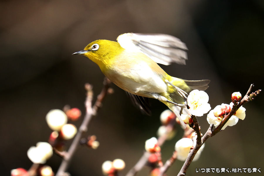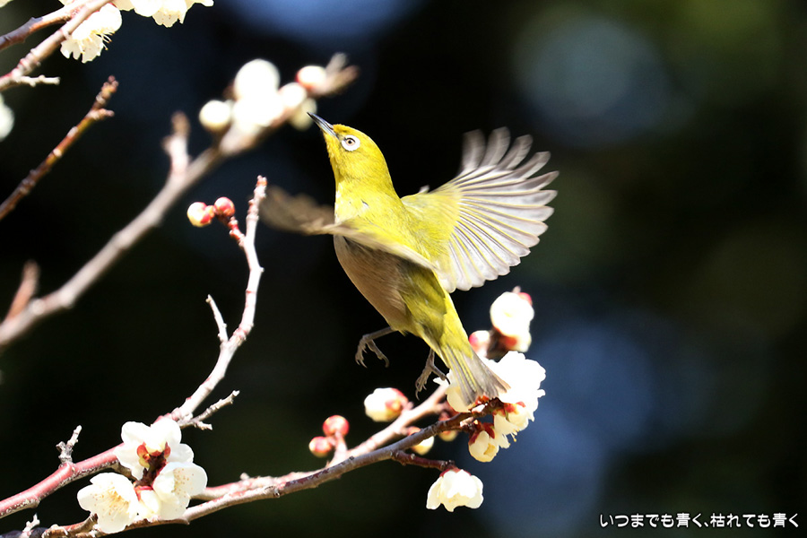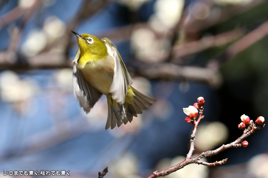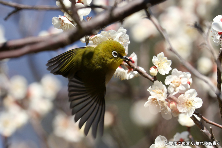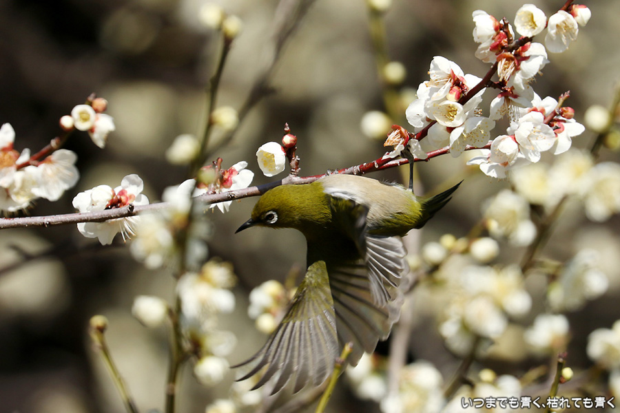 今日は年休をとったので、また平芝梅林公園でメジロと戯れてきました。メジロが飛び立つ瞬間の翼を広げる姿を狙いましたが、狙って撮れるものじゃありません。動きが素早く、高速連写でもファインダーの外に一コマで飛び出すし、ピントを合わせきれないし、難しいです。梅の花の見ごろもそろそろ過ぎてきました。今年の梅とメジロの競演はもう終わりですね。