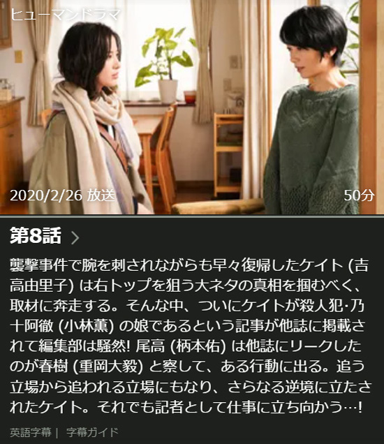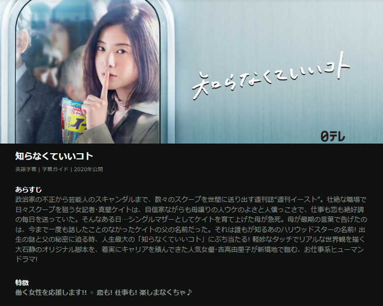 全体におけるエピソードは、ケイトの父親が殺人犯であるということがわかり、その真実を明らかにしていくこと、そして毎回のエピソードとしては、週刊イーストにおけるケイトのスクープが描かれていて、一話完結の小気味よさと、最後まで観ないとわからないケイトの父の犯罪の秘密の興味ということで、最後まで飽きずに観ることができました。タイトルの「知らなくていいコト」は、ケイトの父の犯罪の真実や、スクープで暴く内容について、報道すべきかすべきではないか、真実を知るべきかそうではないかを常に意識させてくれます。他の番組ではスクープ雑誌の記者というとあまり良い形で描かれませんが、このドラマでのスクープ雑誌の職場や記者は魅力的に描かれていて、大変そうだけど面白くてやりがいある仕事のように思ってしまいました。