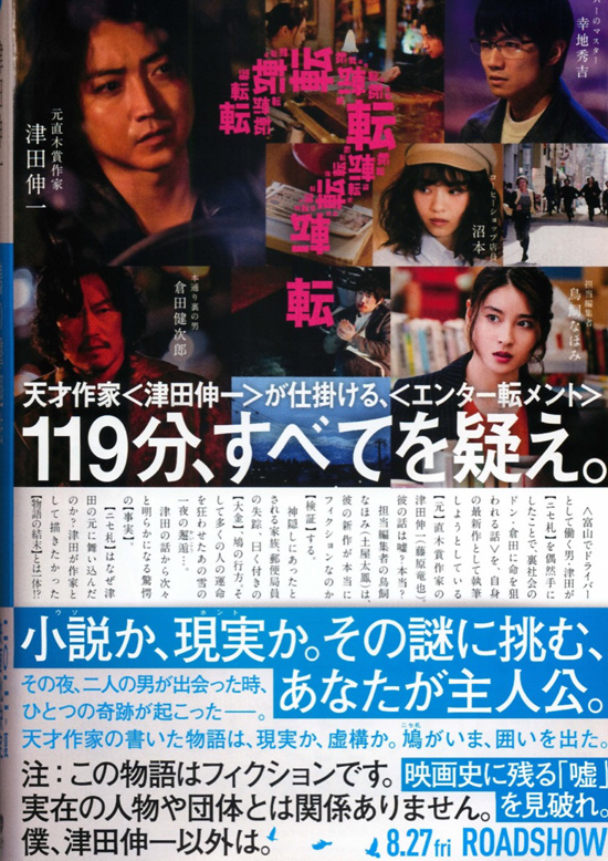 | それなりに面白いストーリーだとは思いましたが、どちらかといえば退屈な映画ではなかったという程度で、痛快さや笑いや感動など、観て良かったというようなものはあまり感じませんでした。津田の書く小説の内容と現実の描き方が最初はわかり難くて、その描き方を理解するとああそうかと観ることができますが、もう少しその前提をうまく導入してくれればと思いました。それと、現実を小説にしているという意味もわかり難くて、この映画で観る人に何を伝えて楽しんでもらおうとしているのか私にはしっくりきませんでした。細かなところでは、偽札の意味もよくわかりませんでした。偽札なんて今では得する犯罪でもないのに、倉田はどうして偽札を手に入れようとしたのでしょうか。「鳩の撃退法」というのは、その現実を小説にしたもののタイトルみたいですが、鳩=偽札と考えても意味不明ですし、よくわかりません。わからないわからないの多い映画でしたが、それでもテンポは良くて退屈はしなかったです。それと、やはり私は藤原竜也は好きにはなれません。どんな役でも同じようなキャラクターにしか見えなくて、この映画ではとても小説家には思えませんでした。 |