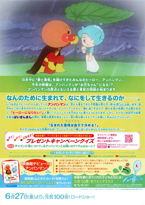 朝一番で、奥さんと長女と次女夫婦と孫2人の7人で「それいけ、アンパンマン チャポンのヒーロー!」を観てきました。この映画の上映中は館内が真っ暗にならず、音を出したり騒いでもよいので、孫・弟くんの映画デビューということで観に来ました。孫・お姉ちゃんは、ちょっと退屈な映画だったかもしれませんが、孫・弟くんは、少し動き回ろうとしましたが、最後までちゃんと観ることができました。次女は、騒いだら途中で外に出ることも想定していたようですが、そんなことは必要なくちゃんと楽しんでいました。