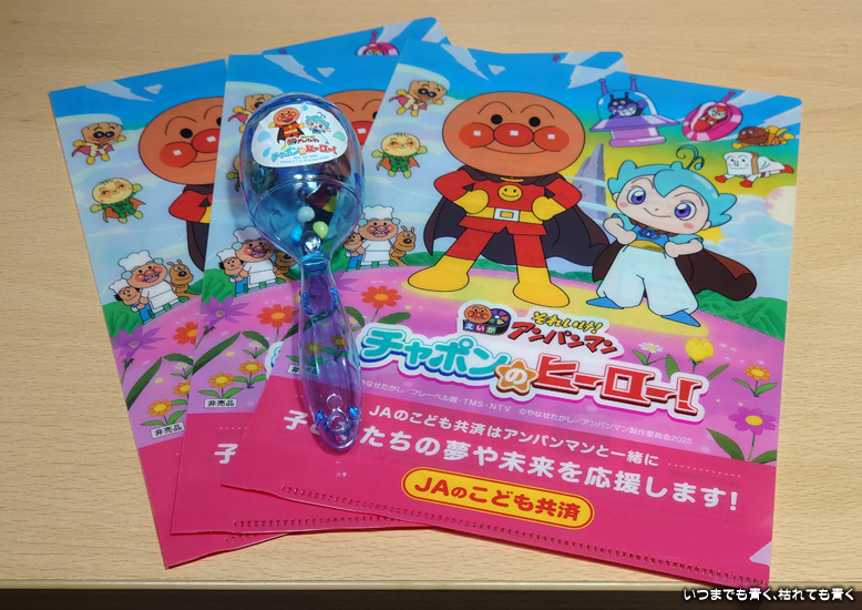 来場者記念品は、人数分のクリアファイルと、子どもの人数分のマラカスでした。映画上映中、観客の子どもたちはそのマラカスを振って楽しんでいました。映画としては物足りないですが、孫や娘たちと一緒に時間を過ごすという面では、こういう映画鑑賞もとても楽しい時間でした。