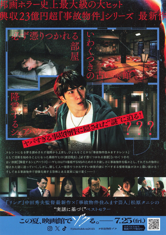上京した桑田ヤヒロ(渡辺翔太)は、“事故物件住みますタレント”として活動を始める。TV番組やSNSで使えるネタを求めて、彼は事故物件を転々としながら、その物件の謎に迫っていく。しかし、心優しくとり憑かれやすい体質のヤヒロは、次々と怪奇現象に襲われる・・・ |