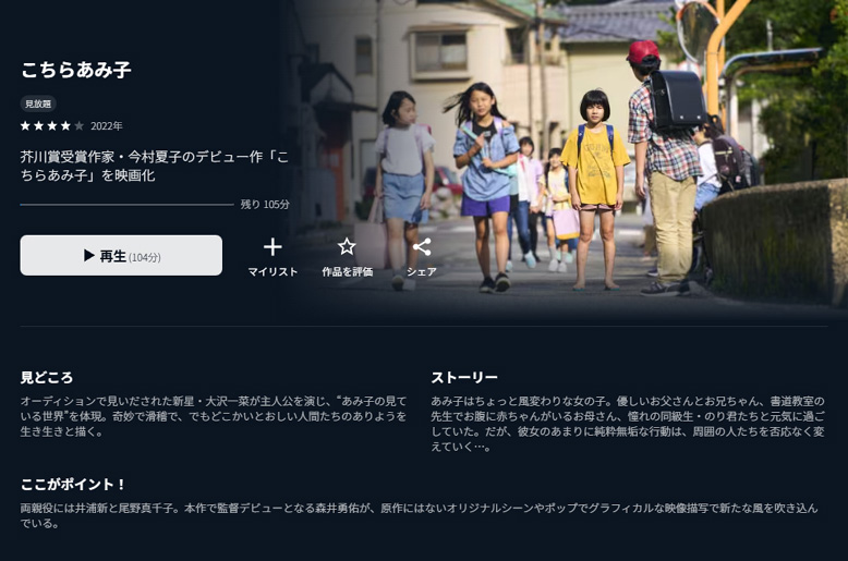 広島で暮らす小学5年生のあみ子(大沢一菜)。少し風変わりな彼女は、家族を優しく見守る父(井浦新)と、書道教室の先生でお腹に赤ちゃんがいる母(尾野真千子)、一緒に登下校してくれる兄(奥村天晴/兼利惇哉)、憧れの存在である同級生の男の子のり君(大関悠士)ら、多くの人たちに囲まれて元気に過ごしていた。そんな彼女のあまりにも純粋で素直な行動は、周囲の人たちを否応なく変えていく・・・ |