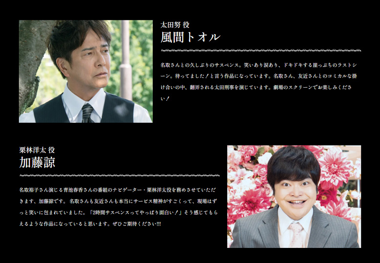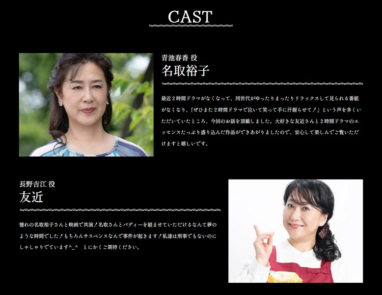 友近がYouTubeで、"2時間サスペンスあるある"が詰め込まれたショートドラマ・2時間サスペンス「崖」シリーズの動画を公開していますが、この映画はそれと同じノリで製作されているような感じでした。雰囲気は懐かしい2時間サスペンスドラマ風でしたが、ちょっと軽くておちゃらけすぎなのが気になって、そこが王道といえる2時間サスペンスではないという思いが強かったです。