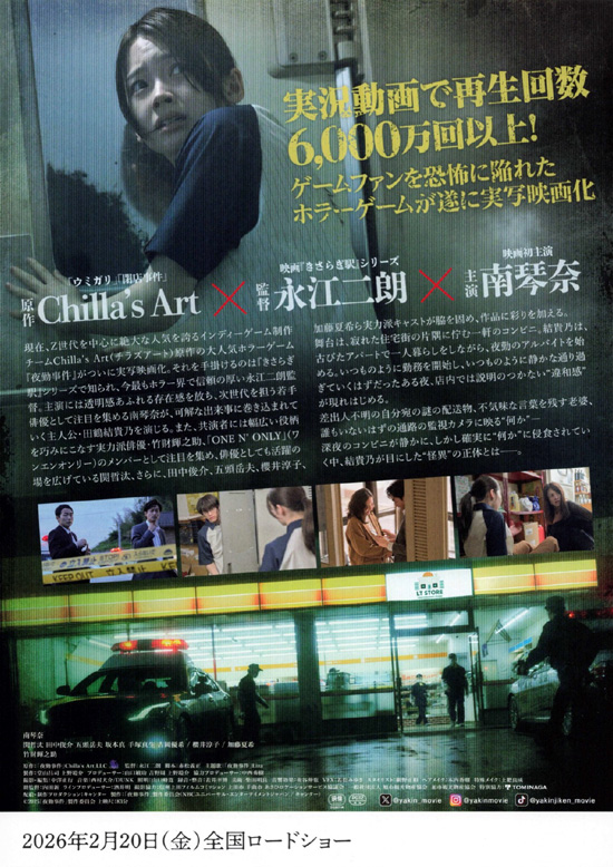 寂れた住宅街にたたずむ1軒のコンビニ。古びたアパートでひとり暮らしをする大学生の田鶴結貴乃(南琴奈)は、高時給にひかれ夜勤のアルバイトを始める。日付が変わる頃、彼女は眠りについた街を抜けて橋を渡り、蛍光灯の光だけが頼りの職場に向かう。店長の指示のもと、品出しや廃棄処理、奇妙な客の対応に追われながら、静かな夜は過ぎていく。しかしある夜を境に、差出人不明の荷物や不気味な言葉を残す老婆など、説明のつかない違和感が店内に現れはじめ、深夜のコンビニは静かに、しかし確実に“何か”に侵食されていく・・・ |