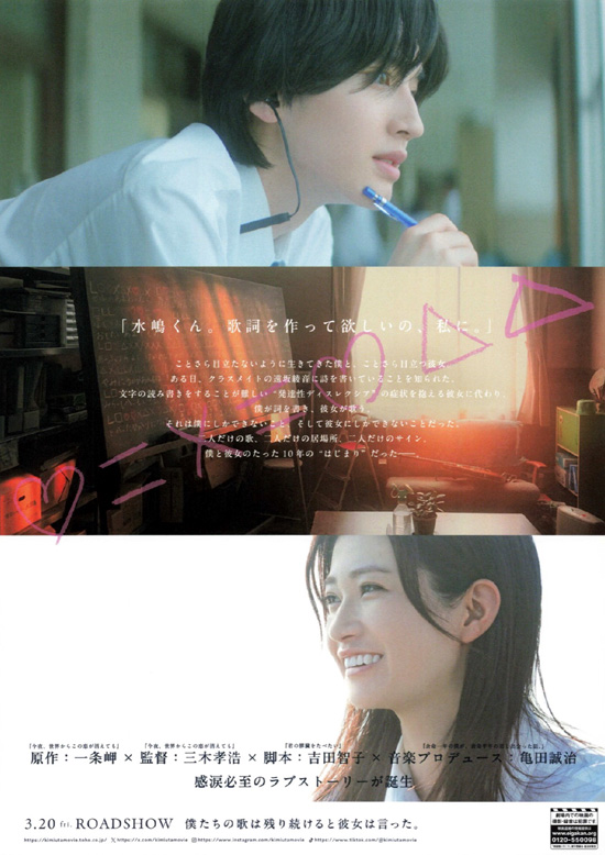 詩作をひそかな趣味とし、代わり映えのない日々を送る高校生・水嶋春人(道枝駿佑)は、クラスメイトの遠坂綾音(生見愛瑠)に詩を書いていることを知られてしまう。綾音は聴く者をひきつける歌唱力を持ちながらも、文字の読み書きをすることが難しい「発達性ディスレクシア」の症状を抱えていた。綾音から歌詞を書いてほしいと頼まれた春人は、放課後の部室で2人きりで歌をつくる時間を通して、少しずつ距離を縮めていくが・・・ |