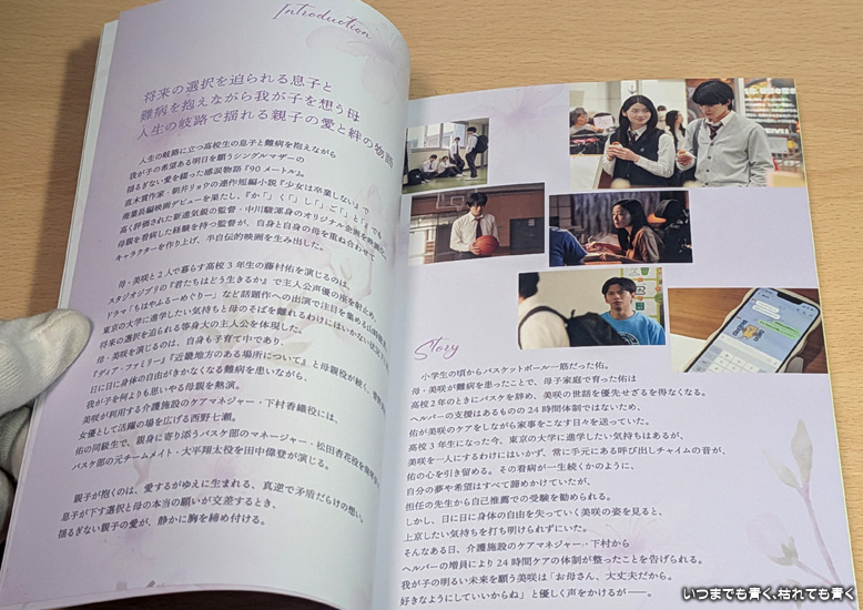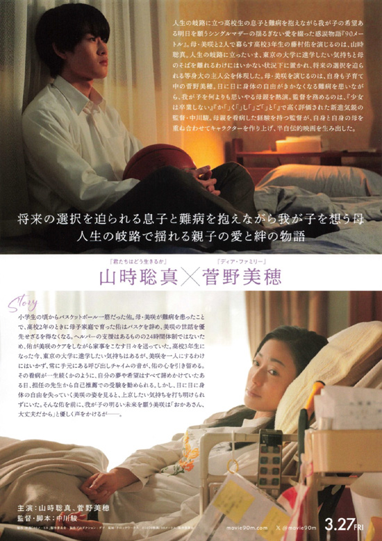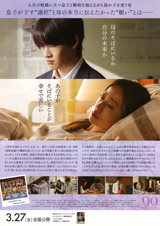 結果的には、家族と一緒に来ればよかったと思わせてくれる感動的でとても優しい素晴らしい映画でした。重くなりがちの家庭内の話と、佑と杏花の高校での普通の高校生らしい話が絶妙で、懸念していた重苦しさもまったくなく、母親と息子のお互いを思う優しさと葛藤や、突然バスケットボールをやめた佑に対する杏花や翔太などバスケットボール部のメンバーとの確執と友情が、とてもいいバランスで描かれていました。佑が、母親を思いながらもいろんなことをため込んでいく苦しさや、バスケットボール部をやめる理由を自分の心の中だけに閉じ込めて友人を遠ざけてしまうとか、そういうところをとてもリアルに山時聡真が演じていました。実際のヤングケアラーの人たちも、自分の中に負担の大変さを閉じ込めて諦めて壊れていくのかなと思ったりしました。そういう佑を出しゃばらずに佑の判断を促すことで力になる杏花を演じていた南琴奈も素敵でしたし、佑が無理をしていることを心配しながらケアマネージャーとして静かに見守って力になっている下村を演じる西野七瀬も素敵でした。そして母親役の菅野美穂は、元気な姿は最初のワンカットだけで、その後は病床での姿だけでしたが、ALSという病にもかかわらず、佑が近くにいてくれる幸せと、佑がやりたいことをするために遠くに行くことの寂しさの狭間で、息子のことを一番に考える強さと優しさを持った母親を見事に演じていました。この俳優さんたちだからこそ成り立った空気感によって、物語がとてもリアルに感じて話の中に入り込むことができて、あっという間の2時間でした。