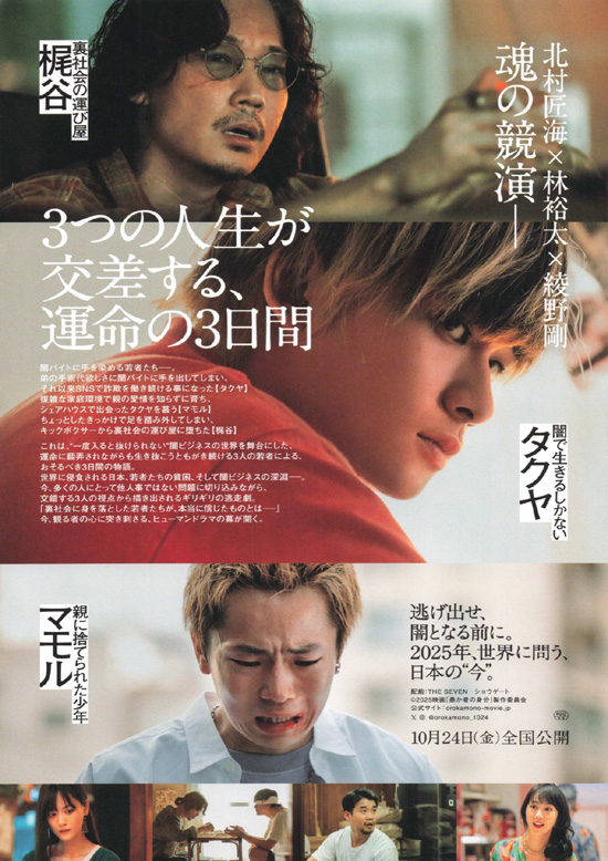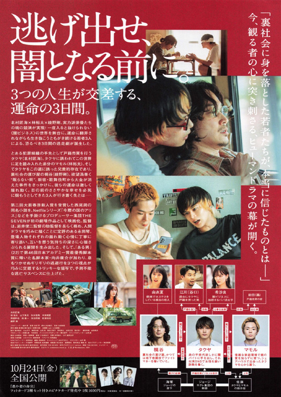 タクヤ(北村匠海)とマモル(林裕太)はSNSで女性を装い、身寄りのない男たちから言葉巧みに個人情報を引き出して戸籍売買を行っている。劣悪な環境で育ち、気づけば闇バイトを行う組織の手先となっていた彼らだったが、時には馬鹿騒ぎもする普通の若者だった。タクヤは自分が闇ビジネスの世界に入るきっかけとなった兄貴的存在の梶谷(綾野剛)の手を借り、マモルとともに裏社会から抜け出そうとするが・・・ |