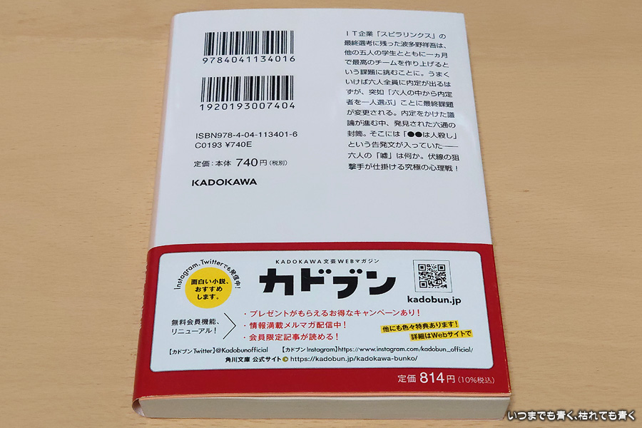 あらすじは、IT企業「スピラリンクス」の採用試験の最終選考まで残った6人の大学生が、最終選考において会社の課題をチームでディスカッションするためにチーム作りをおこなっていたところ、ディスカッションの内容が「6人の中から一人の内定者を決める」という内容に急遽変わり、その場で個人攻撃の封筒が見つかり、その犯人を明らかにしていくという内容です。タイトルから想像していた内容とは良い意味で期待を裏切られたとても面白い内容でした。2011年の採用試験の話と、8年後の2019年の話が並行して進むのでわかりにくいところもありますが(特に2019年の話は誰が話し手なのかわからない書き方なので、想像が膨らみます)、真実に向けたヒントや伏線が随所にあって、何度も戻って見直して感心するということを繰り返してしまいます。(例えば、嶌は座布団が苦手など・・・)