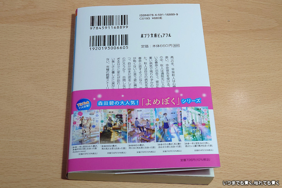 なんなんでしょうね、この小説は。秋人によって春奈と綾香が仲直りするあたりから、最後まで涙ボロボロの内容でした。クリニックで娘の診察を待つ間にも読んでいたのですが、涙があふれてくるので読むのを中断したほどです。設定自体、泣かせる設定ではあるのですが、それ以上に登場人物が、優しくて穏やかで純粋で健気で純朴で、とても魅力的なのです。好きな人や友人のために、自分のできることを精一杯やって、それによって日々が価値あるものに変化し、自分だけではなく相手も生きる力を得る、そういう生き方の素晴らしさをあらためて感じさせてくれました。それは余命に関係なく、後悔しない生き方はどういう生き方なのかを考えさせてくれる内容でした。この作品では、登場人物も相手の思いやりに対してや、できなかったことに対する後悔などで号泣する場面が何度もあります。私はそういう場面では一緒に号泣してしまうほど、私の心は登場人物に重なってしまっていたのだと思います。文章も冗長的なところはまったくなくてテンポよく進み、それでいてそれぞれの感情がとてもよく伝わる気持ちの良い文章でした。