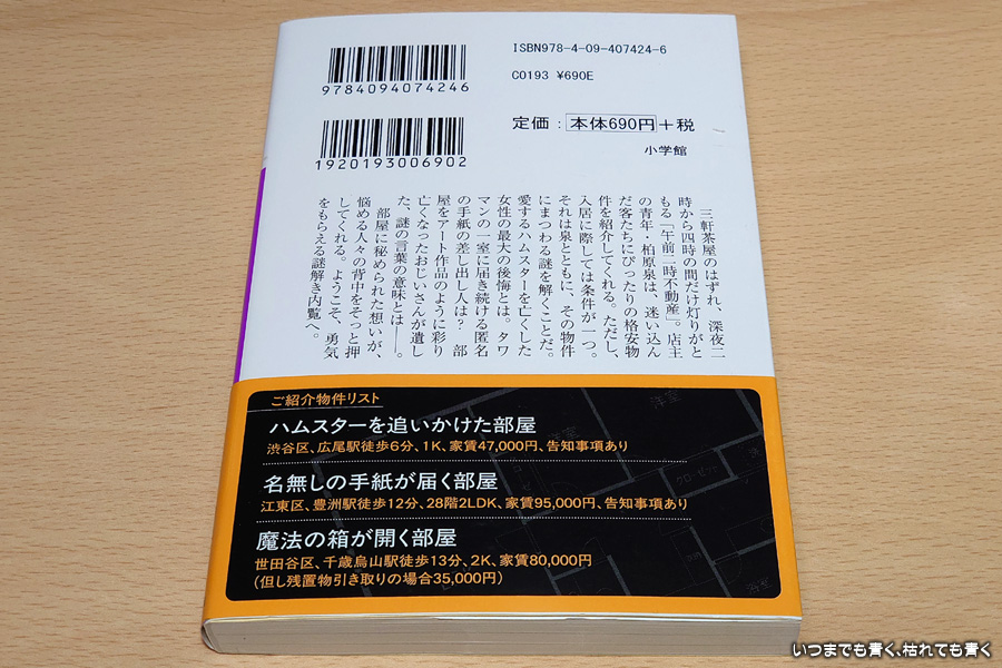 設定は面白く、謎解きもそれなりに楽しめる作品でした。しかし、深夜2時から4時に開く不動産屋という意味にあまり説得力無く、その不気味さも作品全体にあまり感じません。ただ、その時間帯にやる仕事があるという柏原泉の選択という程度です。そんな時間に迷い込んでくるという客も、たまたまその時間帯にいたというだけで、昼間に訪れる客との状況や環境の差もありません。そのあたりがアイデア優先に感じてしまい必然性を感じませんでした。謎解きも、第1章、第2章は裏の裏というような謎の深さや驚きは感じられませんでしたし、第3章は絵がからんできてその部屋の雰囲気が想像できないので、ただ文字を追っていくという感じになってしまい、謎の面白さがあまり伝わってきませんでした。謎を解くことで、元の住民の切なさや悲しさが暴かれていくことになるのですが、その切なさや悲しさも、共感したり感情移入することはできませんでした。特に自殺については、そこに至るまで思い詰める心情が弱くて理解できないですし、第3章も過去に少し一緒に暮らしただけの少女に寄せる家族のような感情がいくらなんでも無理がある(現実的ではない)ように思えます。