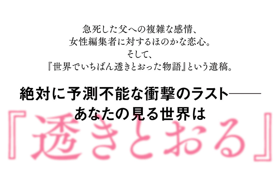 大御所ミステリ作家の宮内彰吾が死去した。宮内は妻帯者ながら多くの女性と交際し、そのうちの一人と子供までつくっていた。それが僕だ。「親父が『世界でいちばん透きとおった物語』という小説を死ぬ間際に書いていたらしい。何か知らないか」宮内の長男からの連絡をきっかけに始まった遺稿探し。編集者の霧子さんの助言をもとに調べるのだが・・・ |