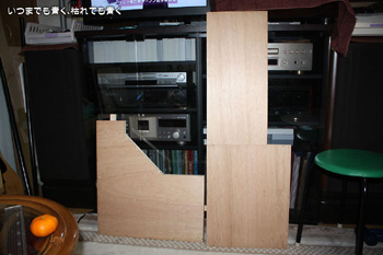 | 下の写真が、正月休みから製作を始めたプレーヤーとテレビの後に追加するボード。プレーヤーとテレビを避けるため少し複雑な形状のボードになっています。 |