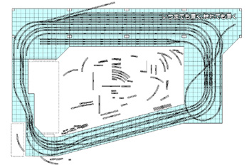 解答のレイアウトスペースは右の通り。オーディオプレーヤーとテレビの後を経由し、オーディオラックの左から複線ループと単線ループを結ぶ連絡線を敷いていたボードへ橋渡しし、大きなループ線を本線としようというたくらみです。 |