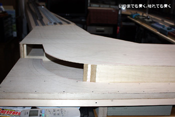 一昨日に作業を終えてボンドの乾燥を待っていた、今回のレイアウトでの唯一の本線曲線勾配区間です。走行上問題ないかどうかは走らせてみないとなんともいえませんが、数値的には556mm(R354の90度)の距離で30mmの勾配で5.4%の勾配となります。Nゲージでは、3%くらいが問題ない勾配と聞いていますので、かなり急勾配の部類になってしまいます。この段階で一度テストをしておきたいと思っています。ただ、複線の下り勾配となる部分ですので加速がついてしまうことはあっても走行不可という問題にはならないのですけどね。 |