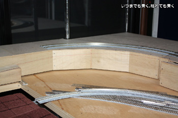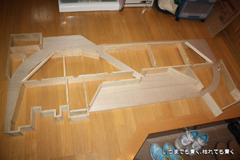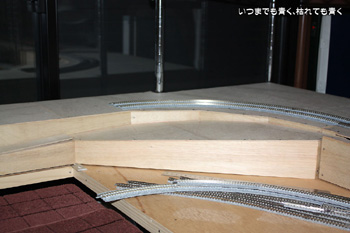 これで狭いスペースでのループではなく、大きなループの線路配置をとることができます。部屋の真ん中に行くときにボードをくぐらなくてはいけなくなったのはちょっと不便ですが、それも大きな目的のためには我慢です。線路プランも出来上がりつつありますので、徐々に形にしていこうと思います。 |