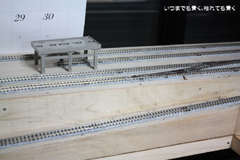 駅の左側(下り方面)に本線と支線をつなぐポイントを組み入れました。これで、本線からは本線にも支線にも入れますし、支線からは本線に出ることができます。ホームの有効長は直線部分で13〜14輌といったところでしょうか。上り側のカーブ部分へ少しホームを延長させることで15輌分の長さの確保を考えていきます。 |