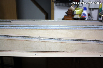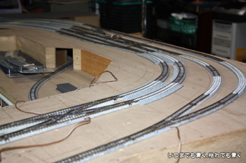 | この編成でも短く感じますので、そういう意味ではこのレイアウトは第一関門は無事に突破ということになります。もうしばらく試走を楽しんでから電気配線を考えたいと思います。 |