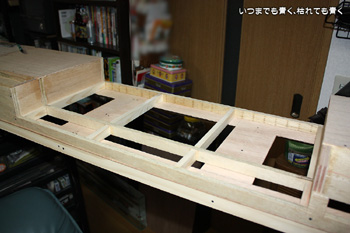 川幅をTOMIXの橋梁2個分とし、その川の位置を決めたら、まずベースのベニヤ板をカット、そして側板と補強板をカットします。文字では簡単にこんな表現になりますが、けっこう面倒な作業です。