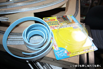 1mm厚くらいのコルクシートやゴムシートは買ってきたのですが、どうも経済的にあいそうもありません。そうしたものかなと考えていて、100円ショップで見つけたのが、クッションテープ。幅3.5cm、約2mmで105円です。幅を半分にすれば線路にぴったり。試しに敷設して防音効果を試してみようと思います。10個買っても1050円ですからね、うまくいけばコストパフォーマンスは抜群です。問題は品揃えですね。店頭に無ければ手に入らないということもありますからね、100円ショップは。 |