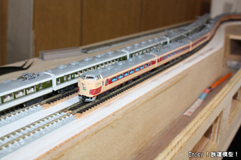 | では、上り:キハ82系「白鳥」14輌編成、下り:189系「あさま」12輌編成、単線:「グレードアップあさま」11輌編成を走らせての試運転の模様です。複線の上とり下りを暫定的に同じパワーパックで動かしていますので、スピードの調整ができていません。 |