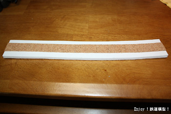 仮設置したフレキシブルレールの位置をマーカーし、いったん取り外します。幅20mmに切り出したコルクシートをマーカーした位置に木工用ボンドで貼り付けます。カーブに順応するために、コルクシートは両側から等間隔に切り込みを入れておきます。