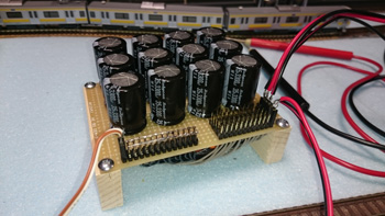 ポイント駆動用のコンデンサ基盤のリード線ハンダ付けもなんとかふたつともやり終えました。 |