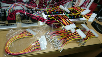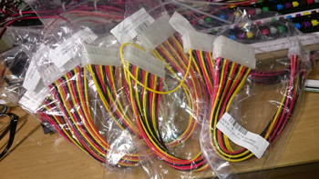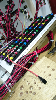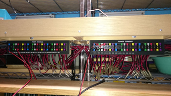 レイアウト側はこのように、24ピンコネクタが4個となります。コントロールパネルとの接続コネクタを間違わないように、カラーシールを張り付けています。 |