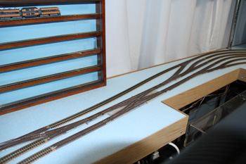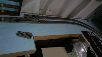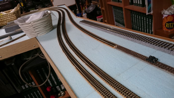 HOの線路をNの線路の上に仮設して、カーブとかの雰囲気を確認しています。思ったほど急カーブには見えないしいい感じです。 |