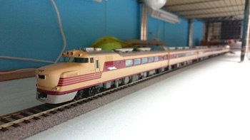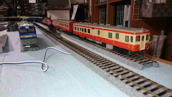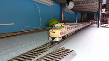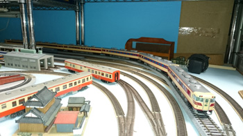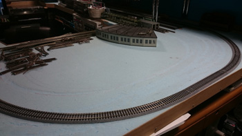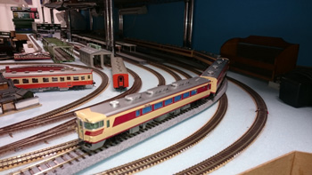 N(9mm)の線路をとっぱらったあとに、HO(16.5mm)の線路を置いてみました。Nで15輌編成も余裕だった駅部分は、1/80だと6輌編成がやっとです。フル編成は無理だけど、見え方や走らせるスピードなどNとは桁違いにリアルなので、短編成でも絵になって走らせて楽しいです。手前のスペースにはNの複線エンドレスを置いて、フル編成も楽しめるようにするつもりです。遅きに失したHO(正しくは16番というのでしょうが)デビューです。 |