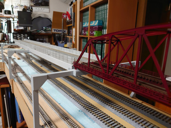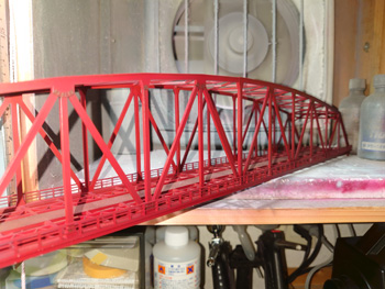 | 大トラス鉄橋のレールの側面を塗って、トラスの塗装艶を抑える塗装を上塗りして、高架線線路の側壁を塗って(少し汚しも入れて)、それらをレイアウトに固定するところまで進みました。 |