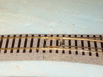 | 外回りの本線から駅ヤードに侵入する4番ポイントは、本線側が分岐側で、最近時折り脱線することがあったので、ガイドレールを取り付けました。これで現在のところ脱線はおきていません。 |