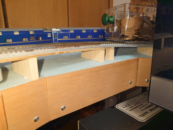 昨日準備した橋脚を、勾配が滑らかになるように位置決めして固定します。固定の重しは小銭です。 |