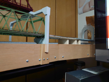 | Nゲージ線路の鉄橋の奥の勾配が滑らかではないところがあるので、きちんと内部の橋脚をつくって滑らかになるように修正します。 |