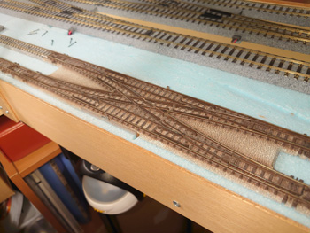 | Nの地上線の複線には両渡り線(ダブルクロスポイント)を2ヶ所入れてありますが、機関区に入るところの両渡り線はオーバースペックなので、片渡り線に変更しました。ポイントマシンの位置も変わりますし、敷設後の線路取り替えはかなり面倒なので迷いましたが、まだ情景の作り込み前なのでなんとか無事に取り替え工事を終えることができました。使わなくなったダブルクロスポイントは、新幹線用の高架線(工事中)に使います。 |