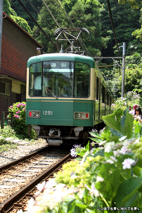 2013年6月17日に撮影した、神奈川県鎌倉市・江ノ電と紫陽花の写真です。