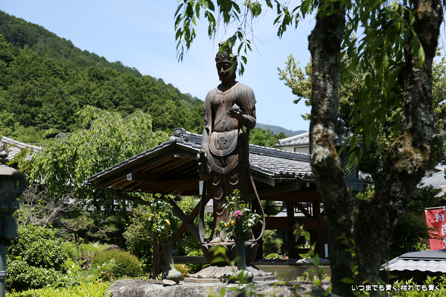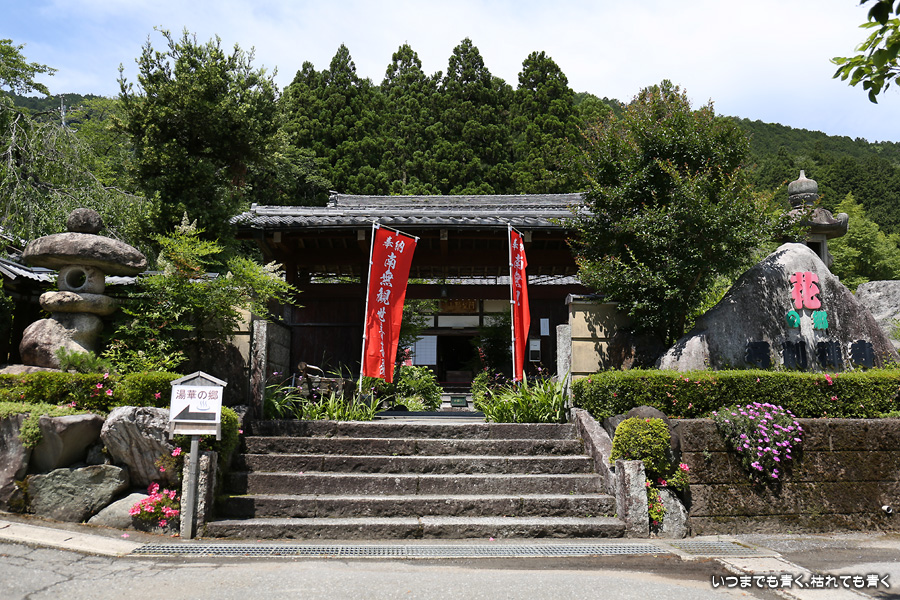 紫陽花の咲き具合はまだこれからという感じでした。ただ、咲き具合だけではなくネットで見た写真の雰囲気と違う感じがしたので、本堂の掃除をされていたご住職の奥様に声をかけて紫陽花の咲き具合などについてお尋ねしました。花や庭の手入れが好きなご住職が昨年末に急に亡くなられたこと、冬に大雪で紫陽花が潰されてしまったことで、手入れ不足で咲き具合がよろしくないのだそうです。その他にも、サツキの木も手入れを頼んだ若い人が芽まで切ってしまい花が咲かなかったこと、本堂の裏には石楠花と紫陽花がたくさんあったのに手入れが大変だとすべて抜いてしまったこと、橘の木や松の木が虫にやられて枯れてしまったこと、鐘楼の脇の大きなしだれ桜が台風で半分折れてしまったこと、檀家のいないお寺なので維持が大変なこと、いろいろと話をしてくださいました。終始にこやかにお話してくださるのですが、お寺の維持、庭園の維持は大変なのだなと思いました。弓削寺は、最澄がこの地を訪れた時に温泉が湧いているのを見つけ、そこを錫杖でかき回したところ馬頭観音が現れたことから、その馬頭観音を祀るために寺が建てられ、その話にちなんで湯華寺と名付けられ、その後白河法皇が華厳寺参拝の帰路に急病になり、ここの温泉で平癒したにより同じ読みで弓削寺を賜ったそうです。今もこの地には温泉があり弓削寺が経営している温泉施設があります。そんな話や、本堂の天井絵のお話、左甚五郎の生まれた地が近くにあったのが縁で左甚五郎の一番弟子が掘った欄間彫刻のお話、アオガエルがたくさんいたお話など伺い、一時間くらい話し込んでしまいました。数年前は、本堂裏の池や紫陽花、参道のたくさんの紫陽花を楽しめたそうなので、もう少しここを知って早く来ていればなぁという後悔と、できるならば以前のような美しい花寺に戻ってほしいという願いで帰路につきました。