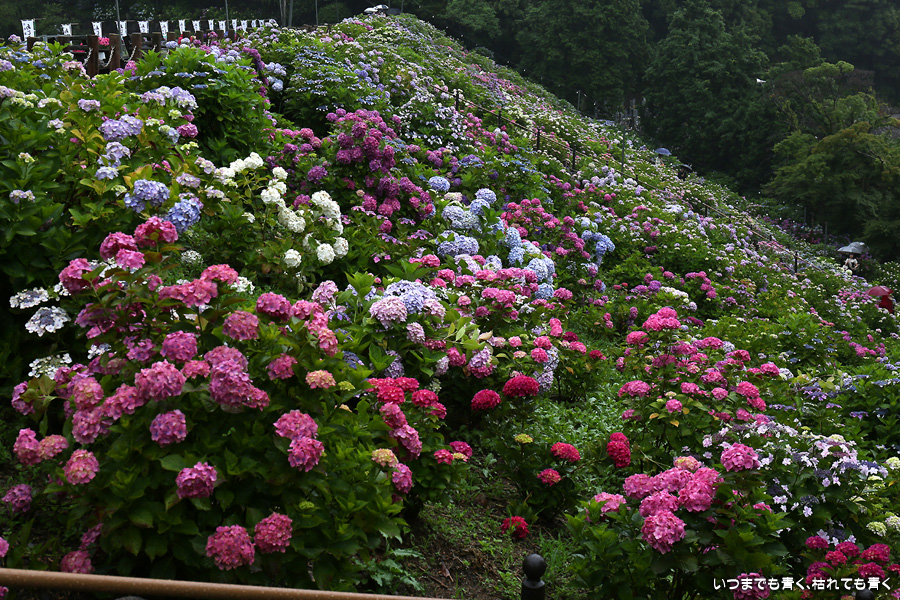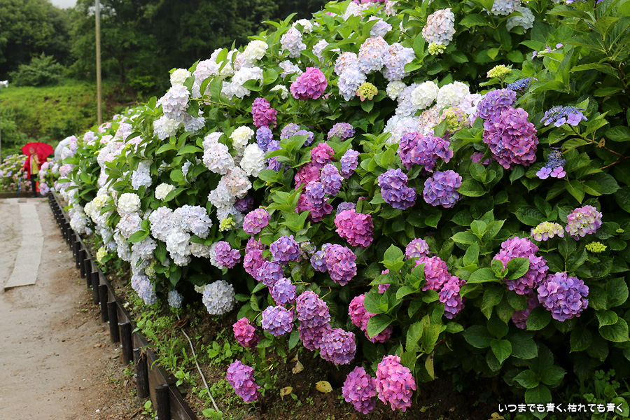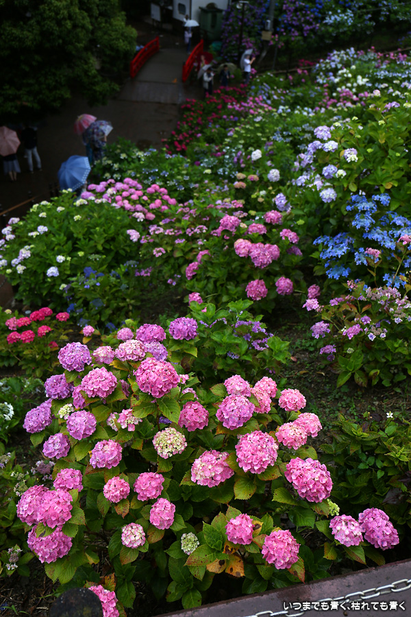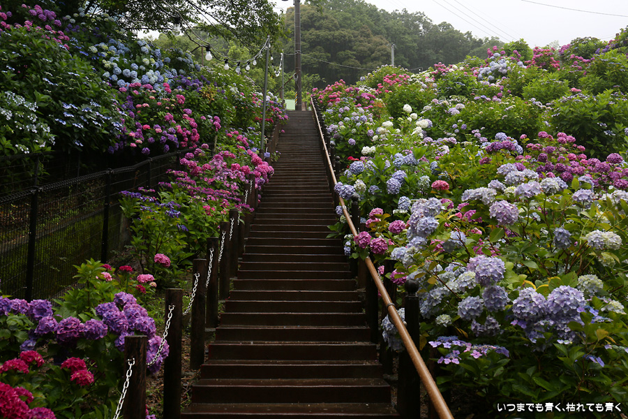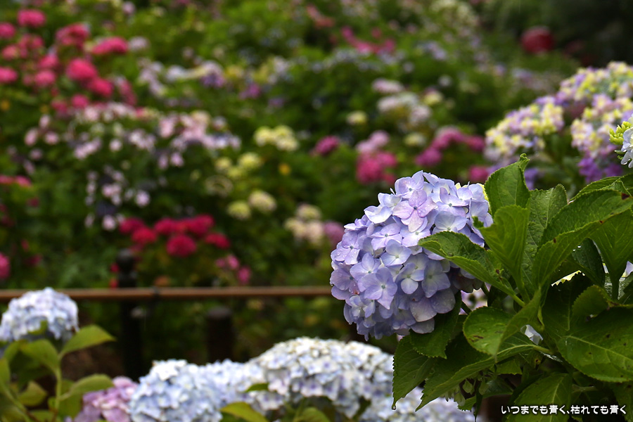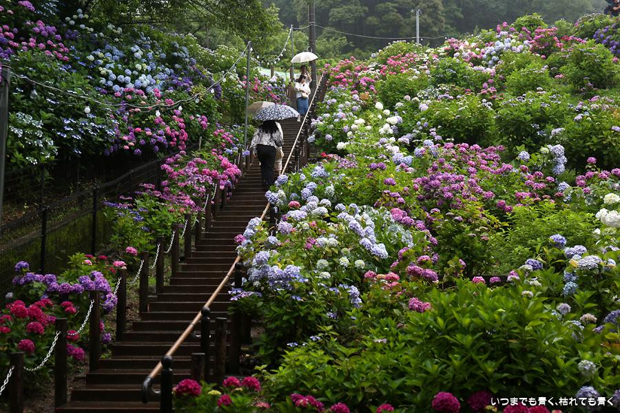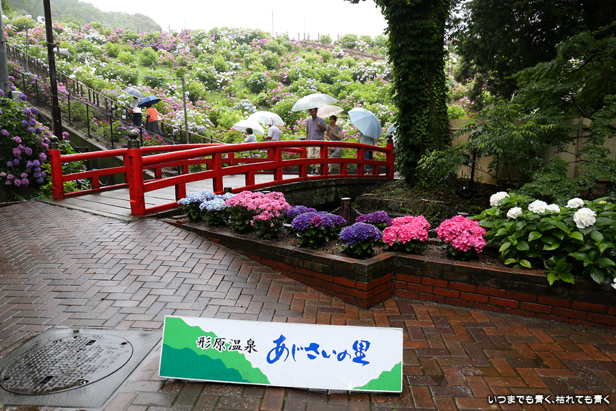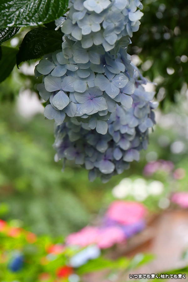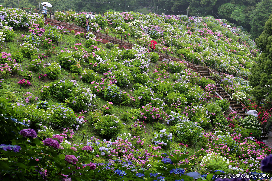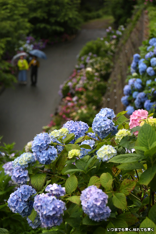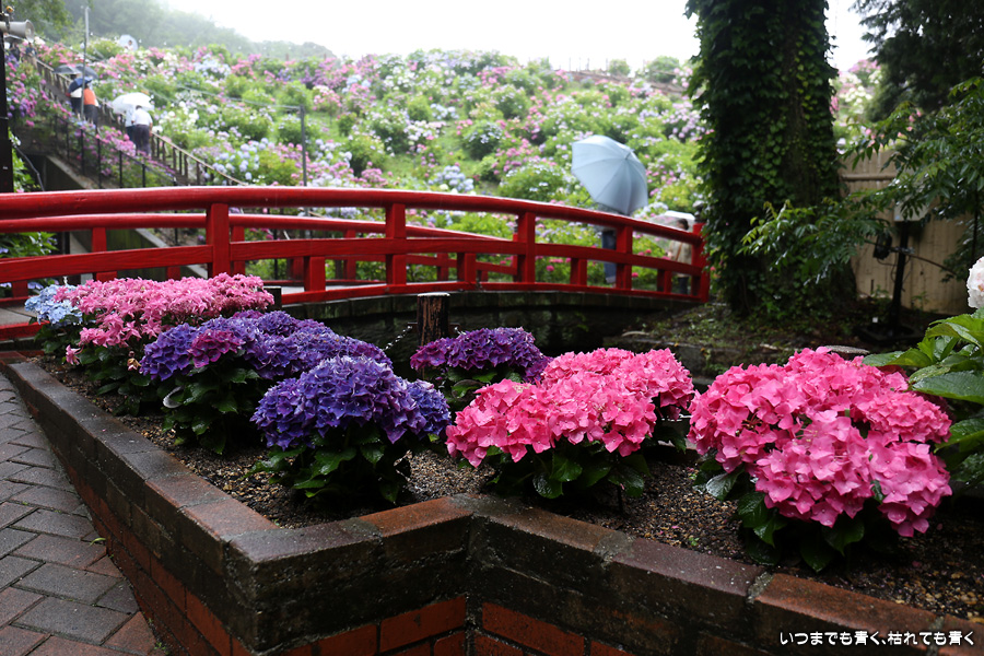 形原温泉あじさいの里は、愛知県では有名な紫陽花の名所なのですが、紫陽花は多くても味気がないだろうと勝手に思っていて訪れることがなかったところです。なので、今回が初めての訪問となります。雨が降っていて紫陽花にはいい感じでしたが、望遠レンズを持ち込むことは難しく、傘をさしての標準ズームレンズでの撮影となりました。形原温泉あじさいの里は、思っていた以上に絵になる素敵なところでした。起伏在り、池あり、橋あり、丘ありの地形にいろんな種類、いろんな色の紫陽花が植えられていて、広い園内を退屈することなく時間を忘れて楽しむことができました。